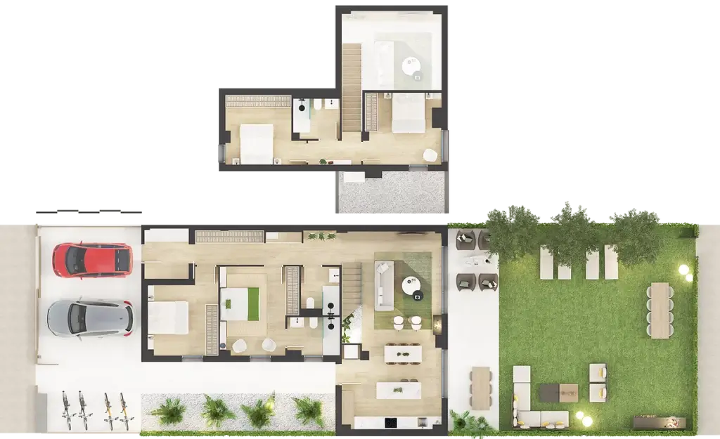 Los dormitorios aumentan de superficie y cuentan con gran capacidad de almacenaje. Su ubicación independiente junto al jardín de acceso favorece un mejor descanso.
